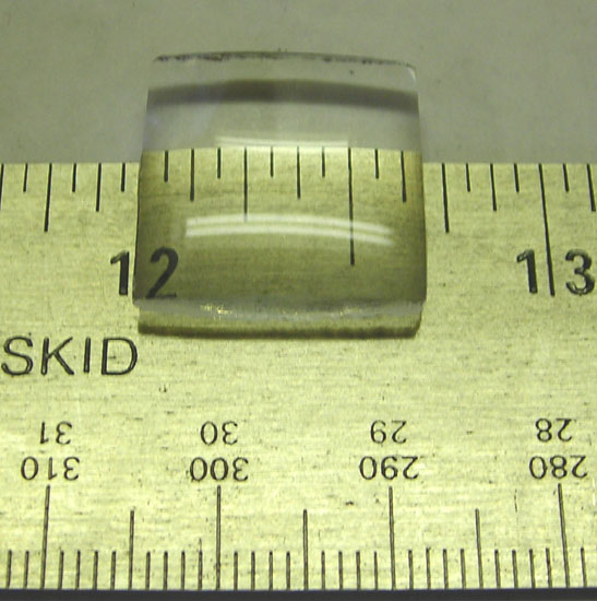 This double convex lens came from our Jaegers stock number 32A3013. This lens is 18mm square by 42mm focal length. It has a center thickness of 4mm. These make great little magnifiers. Edges look a bit choppy in the pictures, but they are not as bad as they look. Unused and individually wrapped from Jaegers.