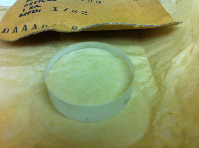 Interesting and unique military plano convex lens with etched reticle. Lens is 28mm diameter by 150mm focal length by 10mm thick. Reticle is on the flat side and has cross hairs and lots of small lines. See second photo. The military NSN number: 1240006041304. Part # 7689439. Manufactured 1/82. Unused in original military packing. Limited supply.