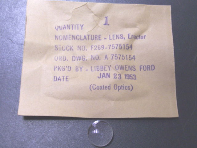 Jaegers catalog #10D 1637. Cemented achromatic doublet, fully coated. Edge thickness is 5mm, center thickness is 6mm. These are in the original box from 1953 labeled "Nomenclature lens, erector, stock# F289-7575154, ORD DWG# A.7575154, packaged by Liberty Owens Ford". Unused, we have quite a few if you want to incorporate them into your project! Price is for a box of 100