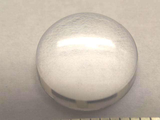 This is an interesting plano-convex lens at 12mm diameter and 23mm focal length. It has a flat base of 12mm diameter by 4mm thick edge. Curve is steep and top is 6mm higher than the base. Total center thickness is 10mm. Individually wrapped. Unused