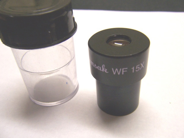 Standard microscope eyepiece size (23mm). Coated optics. Wide field. 15X with crosshair reticle. New/Unused in plastic container with threaded cap. Our L1862D eyepiece is the same but without the reticle. Wollensak Optical, quality optics since 1899