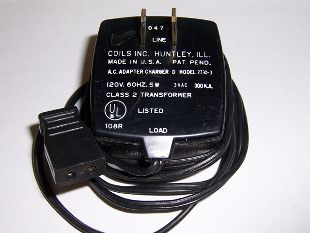 Made by Coils Inc. in Huntley, IL this AC adapter charger provides 120VDC, 60Hz, 5W, 3VAC. This item has a 4-1/2 foot cord and goes into a 110V outlet. The connecting end is 3/8" x 3/4" and has two holes that are 1/16" away from the center of the connector. The holes are 5/32" in diameter.