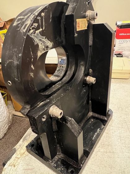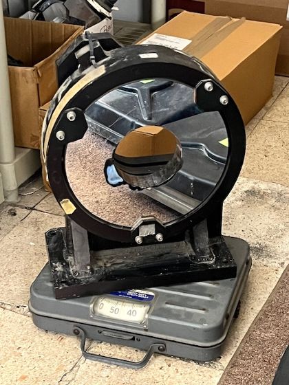Mounted glass mirror flat 10 inch clear diameter with a 4 inch center hole. 1.5 inches thick. Coating is breaking up. Mounting is such that the mirror stands perpendicular. See photos. We get nice straight lines with our 1/20 wave flat. Mirror mount alone is worth our price. Weighs 47 pounds. Only have one.