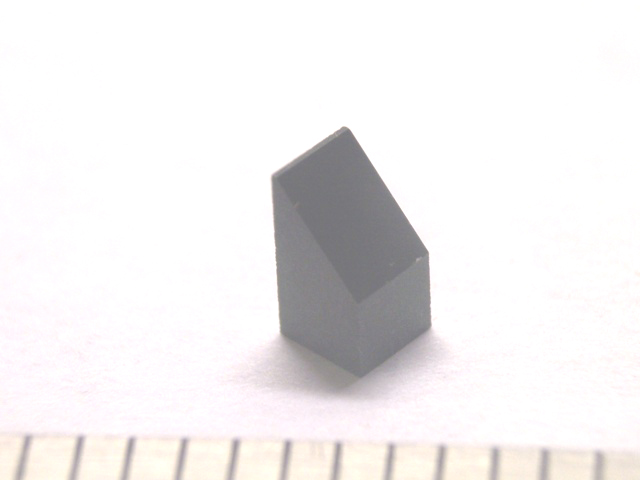 These are unused and come in a pill capsule. All sides are black and fine ground (maybe opaque glass?). The side with the 45 degree angle measures 5mm x 3mm and has been polished to about 1/4 wave flatness, but not aluminized. The entire mirror is 6mm long x 3mm wide. Probably this is an unfinished prism.