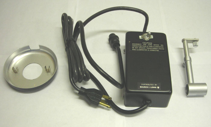 This is a Bausch and Lomb 115VAC 60 cycle power supply that converts to 750V 45mA. The power supply is 5-1/4 long by 3 wide by 1-3/4 thick. The light housing is 4 in diameter by 3/4 thick. The machined bulb holder is 3-5/16 long by 1-5/16 wide. Has two set screws. One to hold the holder in place and the other to extend the rod to make the lamp shorter or longer. Unused.