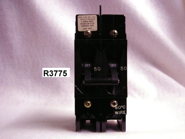 Model 209-2-1-60-4-9-50 special use dual circuit breaker. 50 full load amperes, 240 VAC max, 50/50 Hz. Unused, removed from new scientific instrumentation. Only have a few.
